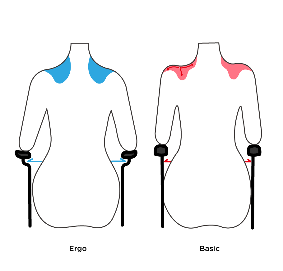 The ergonomic armpad is curved inward according to the way users lean their arms and elbow on the pad. The pad is also narrower at the bottom edges, creating less obstruction for the hands while propelling.